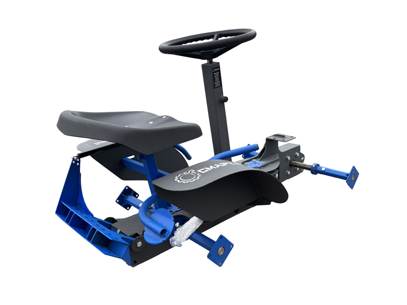 Рама выполнена из листового металла толщиной 4 мм с усиленными узлами на конических подшипниках. Крутящий момент передается через две усиленные цепи, а поворот осуществляется рулевым редуктором с тягой на шаровых шарнирах. Фрикционный тормоз с ручным приводом обеспечивает надежную остановку. Сиденье анатомической формы из стеклопластика делает работу комфортной, а окраска высококачественной автомобильной краской защищает адаптер от внешних воздействий.